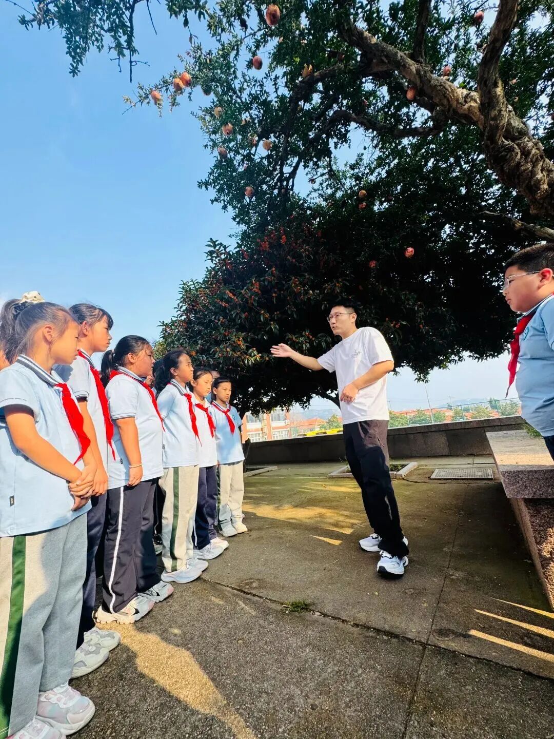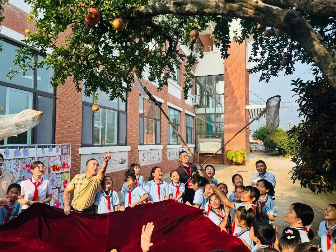 “采摘开始!”一声令下,队员们欢呼着涌向石榴树。低年级队员踮脚轻托,高年级队员协作采摘,红彤彤的石榴落入掌心,欢声笑语洒满校园。“这是我们学校的石榴,特别甜!”队员们将果实分享给老师、伙伴,团结感恩的情愫在传递中流淌。