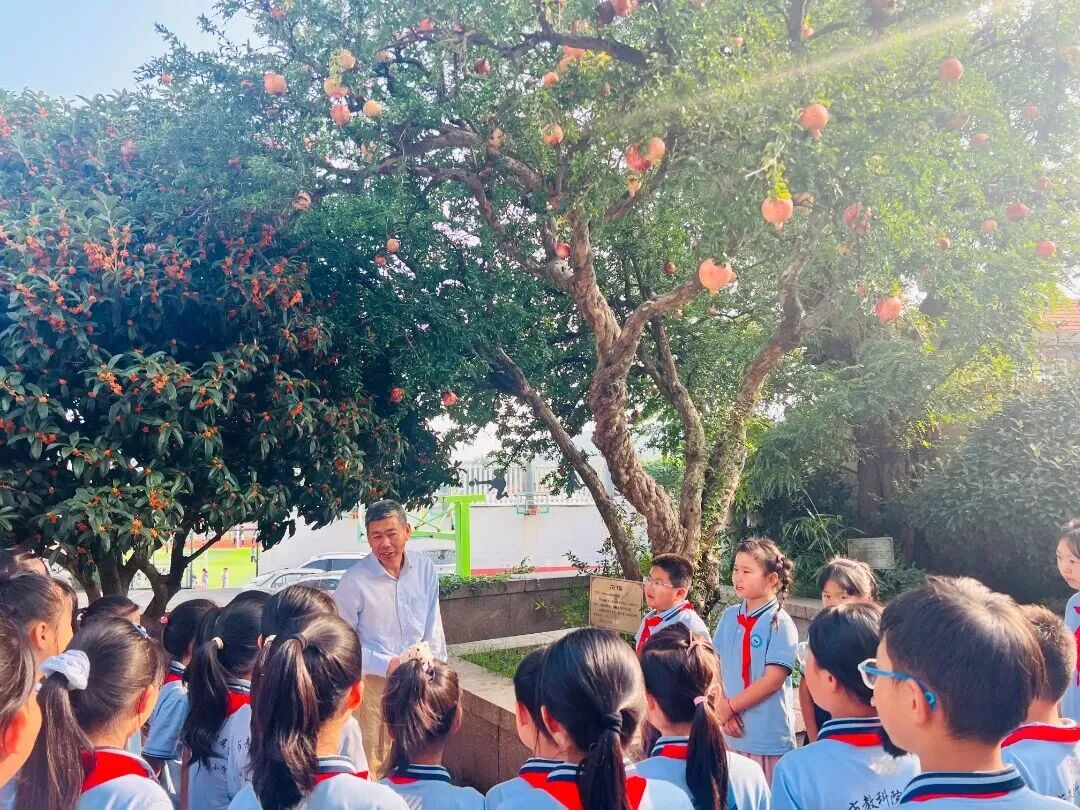 最令人期待的环节在石榴树下展开。学校特邀退休教师王敦谦爷爷与校友家长代表王桂晓叔叔,与队员们共话“登小故事”。王爷爷回忆起粉笔黑板年代的育人点滴,王桂晓叔叔生动地回忆起自己上学时的校园生活,队员们仿佛穿越时光,触摸到不同年代里同样鲜活的成长记忆,触摸到母校的温暖脉络。