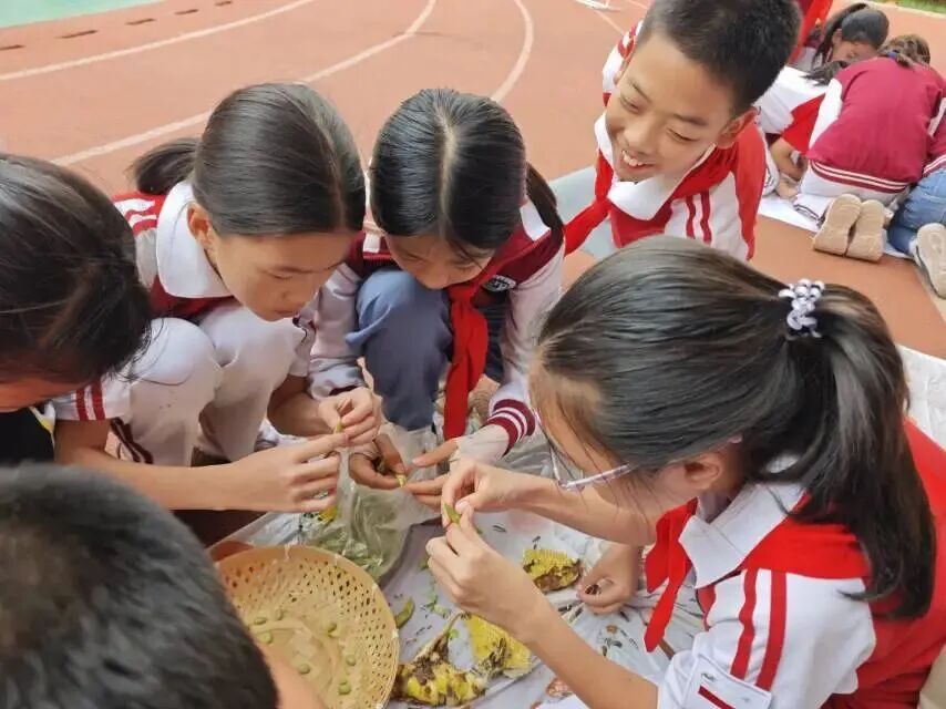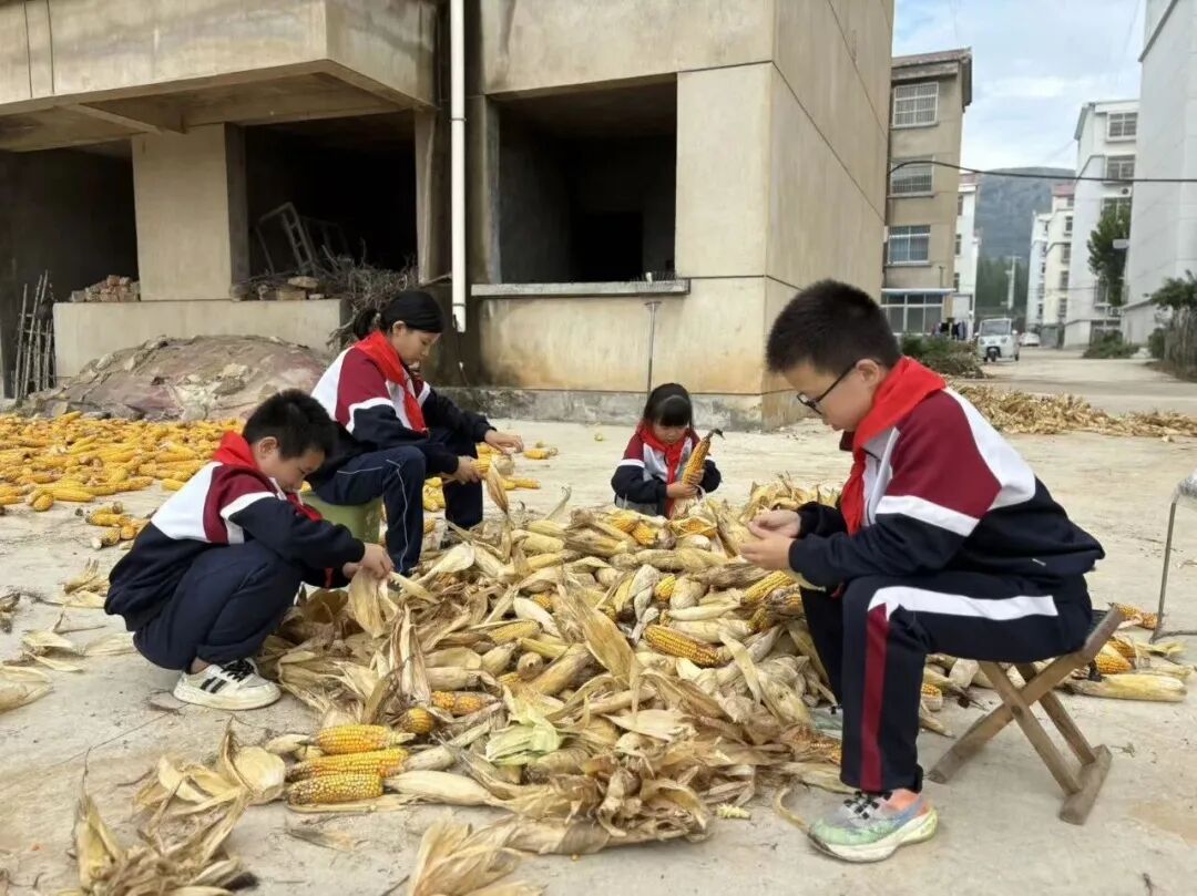 脱粒区的场景满是丰收的烟火气。队员们围坐在一起,指尖翻飞剥着玉米、花生、毛豆和葵花籽,比拼速度、分享技巧,亲身感受“秋收万颗子”的辛劳与喜悦,更坚定了节约粮食的决心。