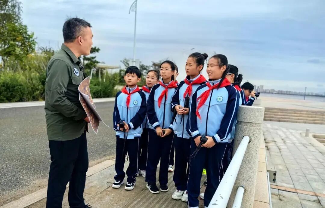 活动中,少先队校外辅导员、城阳区野生动植物保护协会会长徐立强向队员们详细讲解了反嘴鹬的外形特征和生活习性,示范了望远镜的正确使用方法及观鸟注意事项,充分激发了队员们的探索兴趣。随后,队员们手持望远镜认真观鸟,时而屏息搜寻,时而低声分享发现,“反嘴鹬的嘴巴是弯的”“它抓到小鱼了”等童真惊叹不断响起,沉浸式感受着湿地生灵的灵动。