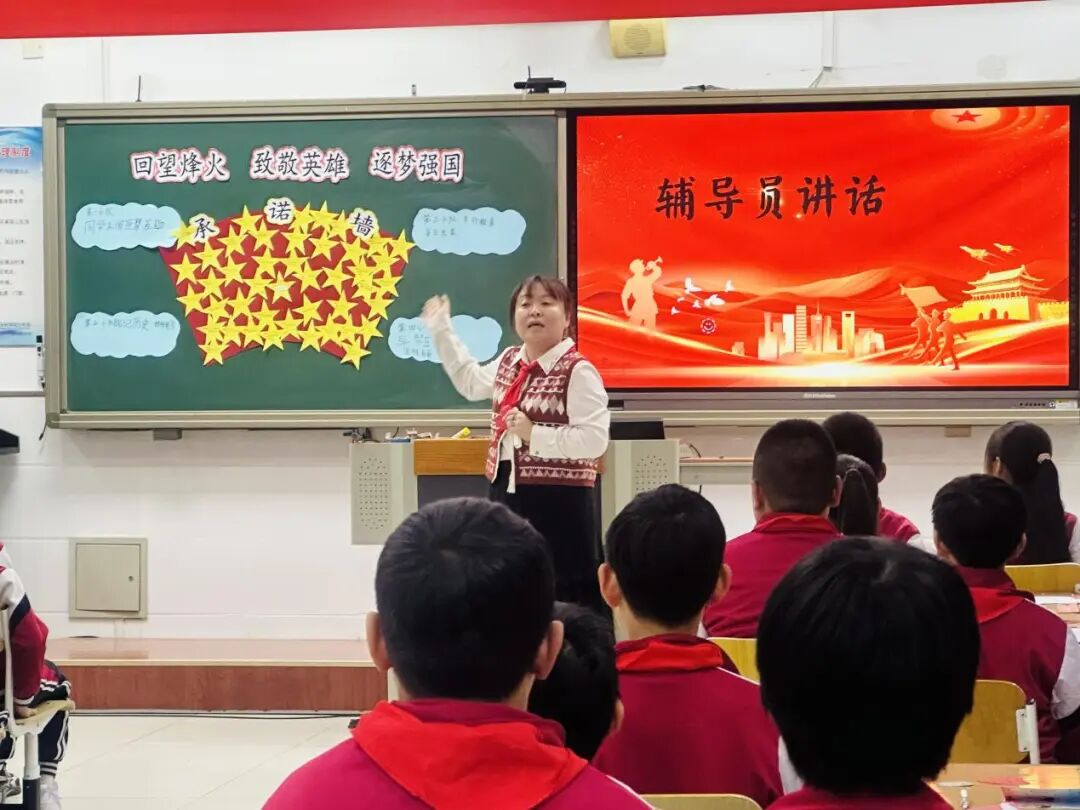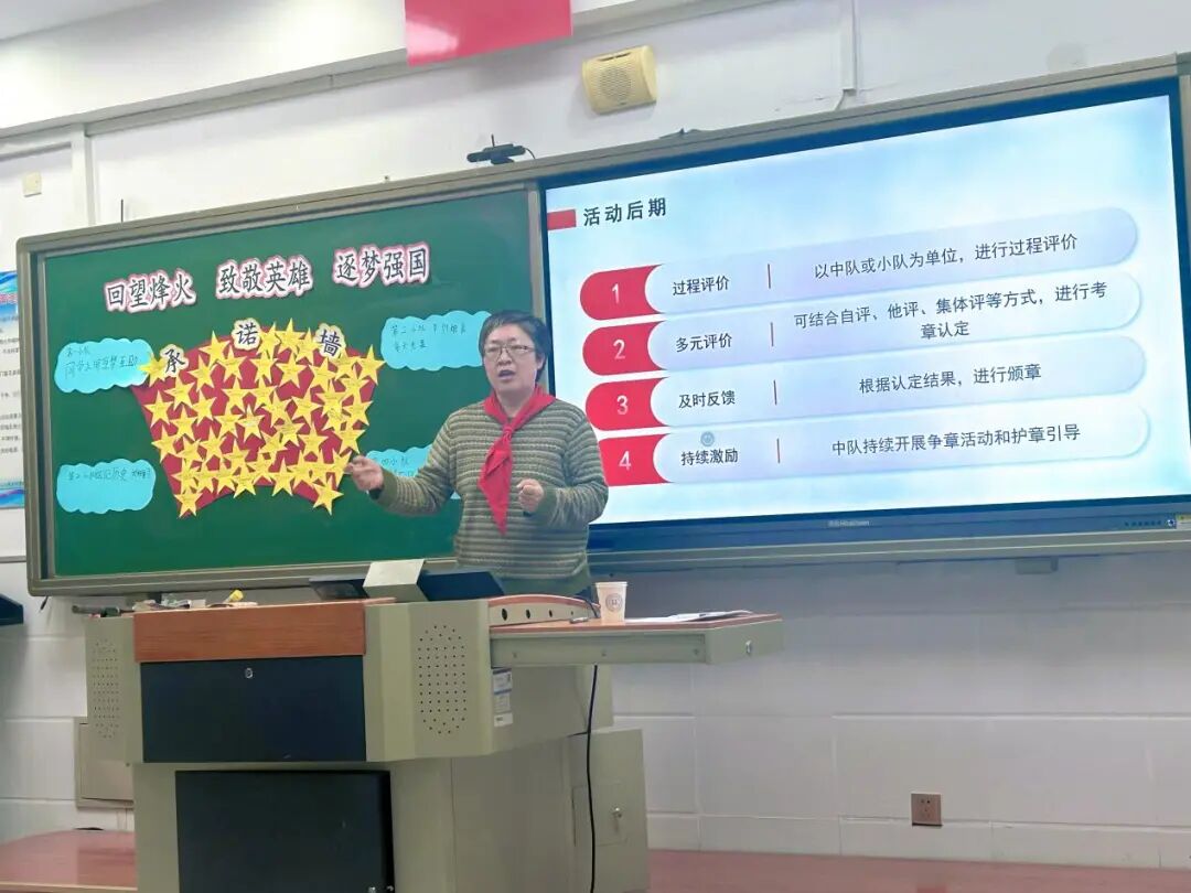 崔老师的少先队活动课《回望烽火 致敬英雄 逐梦强国》,课程伊始呈现红领巾争章任务要求,队员在争章任务引领下开展活动。活动课以“厚植家国情怀、树立正确历史观、传承红色精神”为核心教育导向,通过多元化环节设计,帮助队员清晰了解抗战关键历史事件、熟知 2025 年阅兵核心亮点,明确“铭记历史、缅怀英雄、珍爱和平、强国自强”的深刻内涵,最终将伟大抗战精神转化为成长动力,培养队员国防意识与“强国有我” 的责任意识,助力其成长为有理想、有本领、有担当的新时代少先队员。