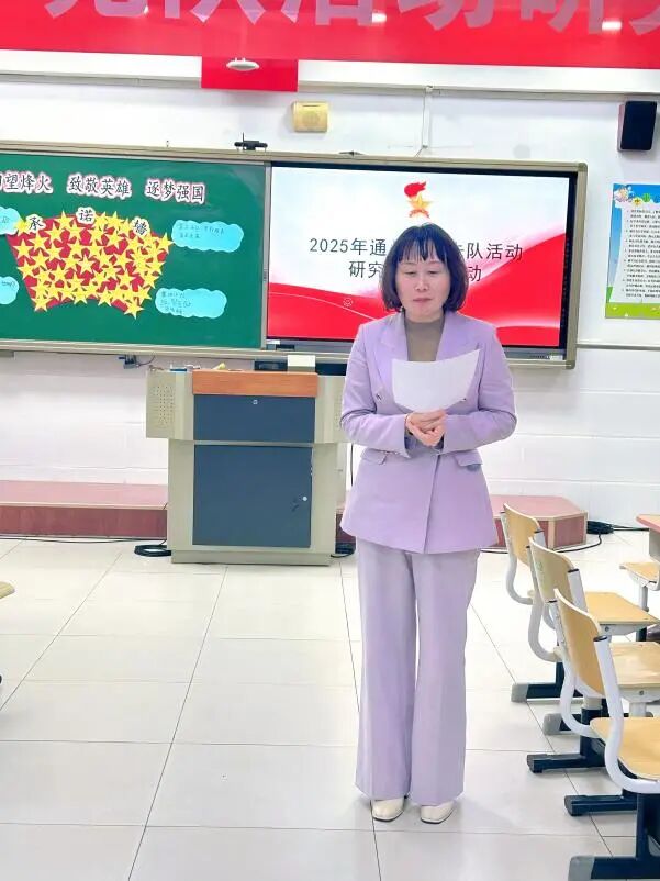 北京市第五中学通州校区团委书记蔺晓亮老师,在观摩两节少先队课后分享了见解。她肯定课程以“历史—英雄—当下—未来”为主线的清晰逻辑,赞许其让队员在时空串联中深化价值认知的设计巧思;同时提出优化建议,强调要关注不同层次队员的参与需求,通过丰富互动形式、细化任务分工等方式,充分调动全体队员的课堂积极性,让少先队课的育人实效覆盖每一位队员。