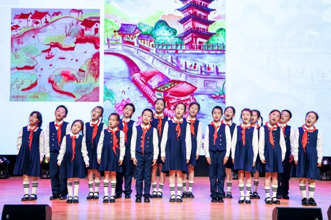 活动现场展示了北京市通州区“发现副中心之美”主题征集活动的优秀作品,少先队员们合唱《扬帆启航少年梦》。