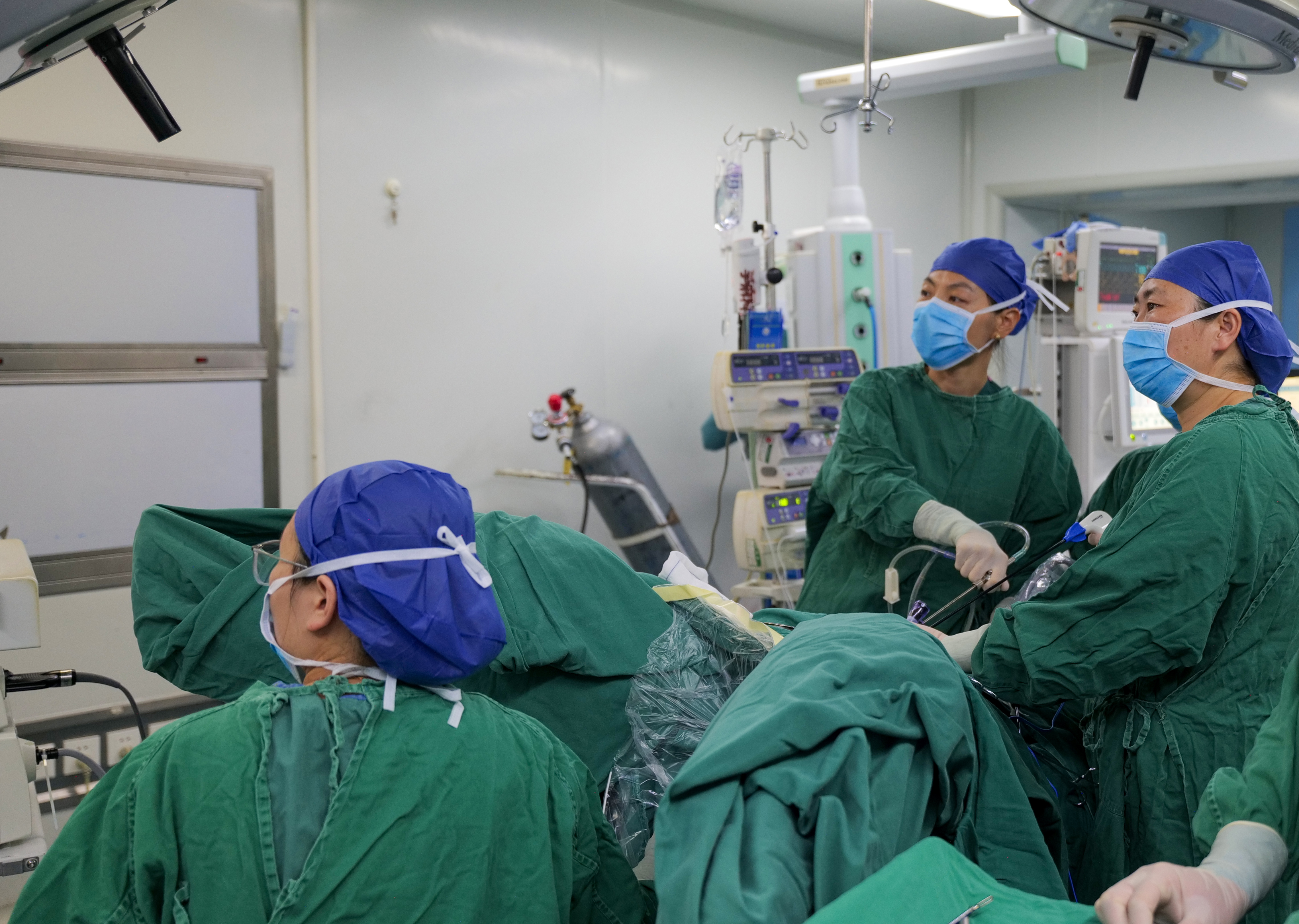 2025年8月4日,北京大学人民医院第十批援藏妇科医生张果(中)与西藏自治区人民医院医生李芳(左)一起为患者做手术。新华社发(柑丹鸯琦 摄)