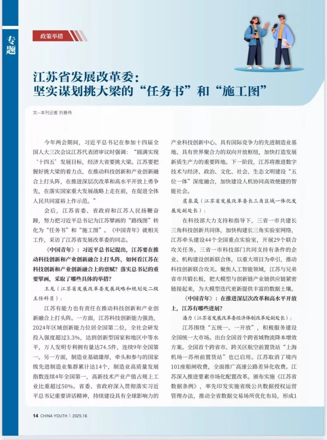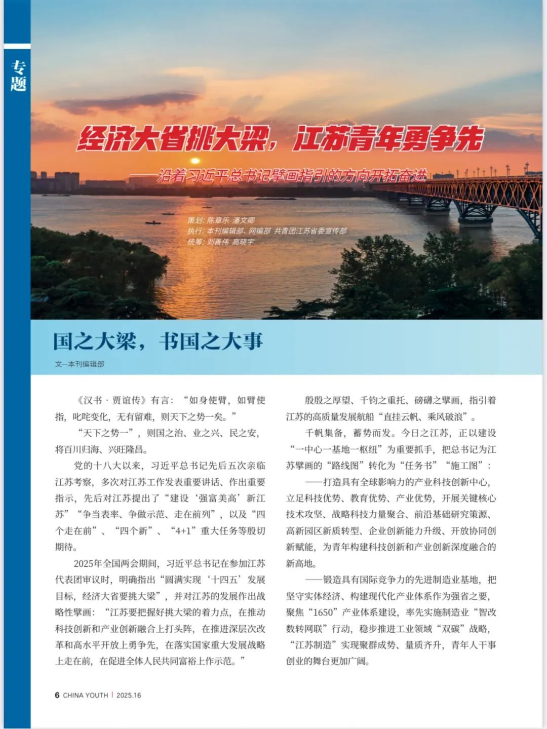 为探寻记录习近平总书记擘画指引下的新时代“挑大梁”风采,《中国青年》记者近期组成4个团队,赴江苏13个城市采访,形成了本专题。