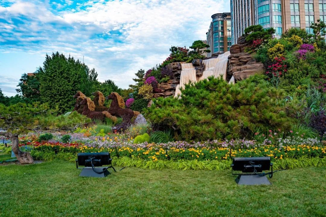 花坛主景的瀑布、山石采用玻璃钢工艺,彩绘的瀑布与真水、迷雾共同呈现壶口瀑布壮阔的景观。群马采用穴盘苗栽植工艺。造型松、龙柏、锦带等二十余种乔灌木塑造了丰富自然的山体景观。