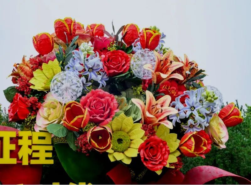 花束中的花朵,蒲公英象征、“希望与坚韧”,月季“黄和平”象征着“幸福、光荣与和平 ”,百合象征着“幸福美满,纯洁无瑕、庄严圣洁”,郁金香象征“友谊长存”。