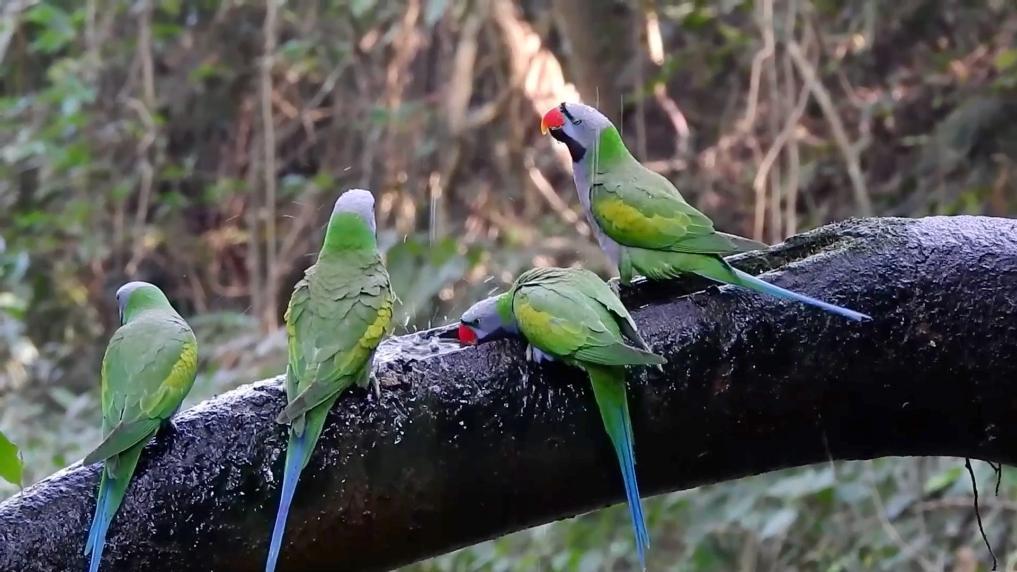 近日,在云南省普洱市思茅区思茅港镇茨竹林村芒坝村民小组,成群的国家二级保护动物大紫胸鹦鹉飞临村子周围的榕树嬉戏。