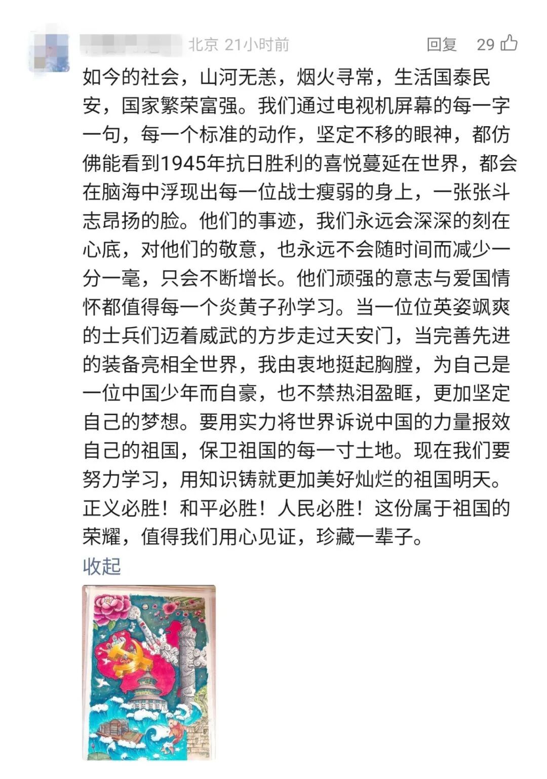 阅兵式结束后,我暗暗下定决心:一定要好好学习,锻炼身体,长大后为祖国贡献自己的力量。请党放心,强国有我们新时代的少先队员!