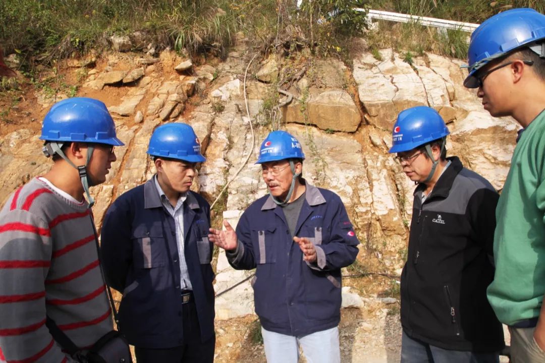 南仁东在大窝凼施工现场与工程技术人员讨论(2013年12月31日摄)。新华社发(中国科学院国家天文台供图)