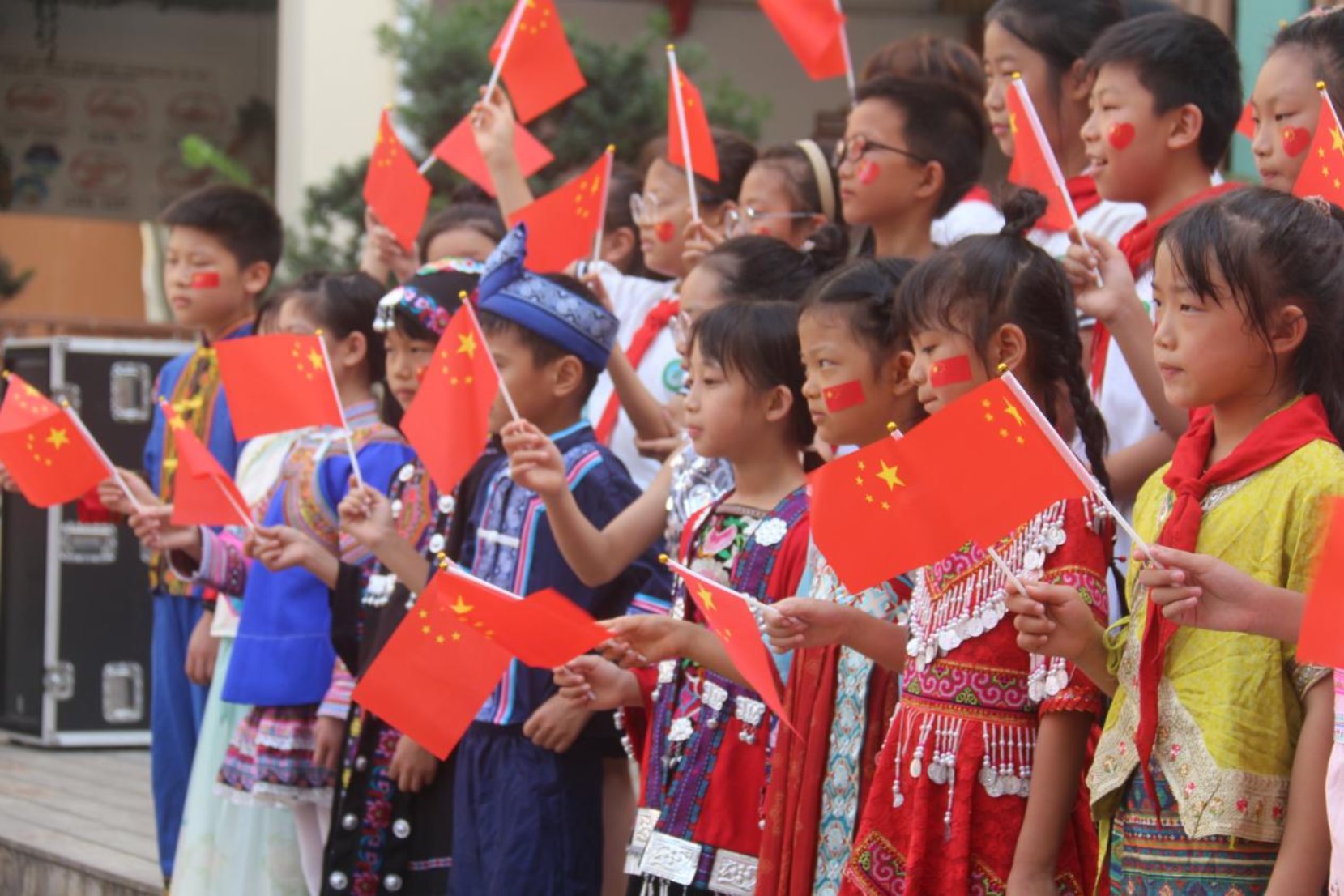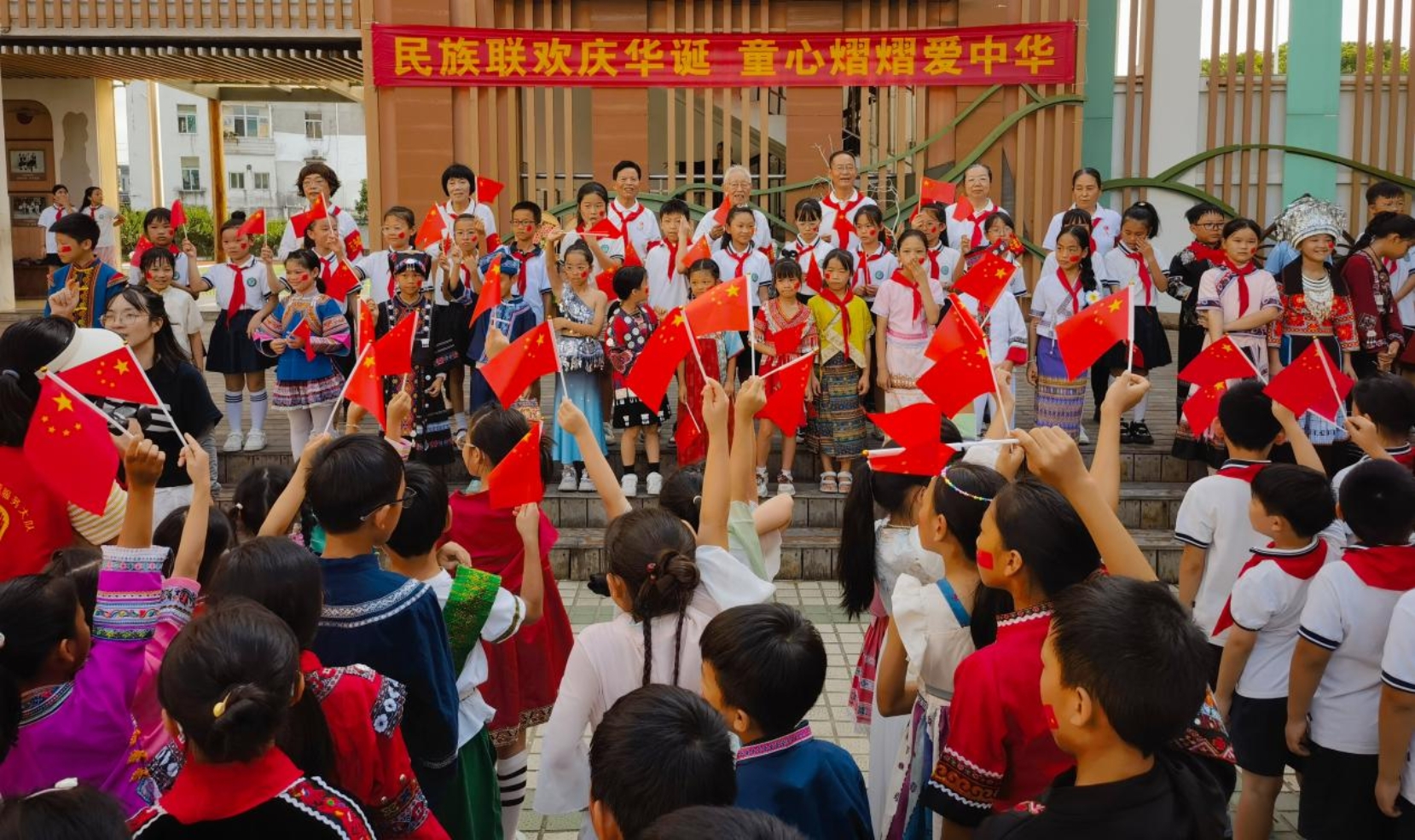 “月圆人和”才艺展示中,少数民族队员代表和各中队代表一起登场,竖笛版《灯火里的中国》、小组唱《今天是你的生日》……最后《我和我的祖国》旋律响起,队员们自发拉手,举小国旗挥舞,苗族队员的银饰随动作轻晃,壮族队员的绣花裙摆灵动。