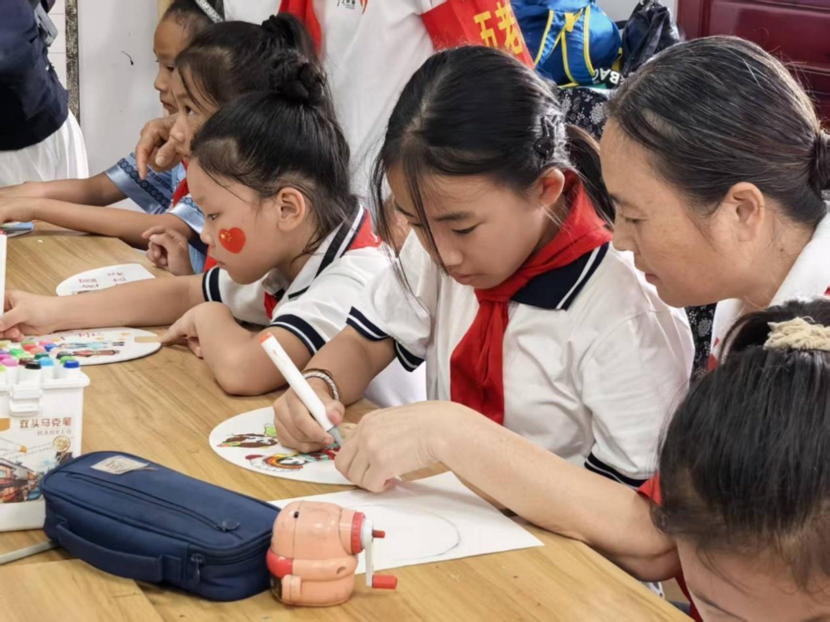 “月印匠心”绘画区里,民族 DIY 社团队员围坐创作。五年级队员涂画夜空时,彝族队员凑过来提议:“加个彝族火把吧,像过节一样热闹!”两人头挨头画出跳动火焰;队员在给民族服饰涂色,奶奶教他用渐变色……一笔一画间,圆月、国旗与民族元素交融,传统文化的种子悄然发芽。