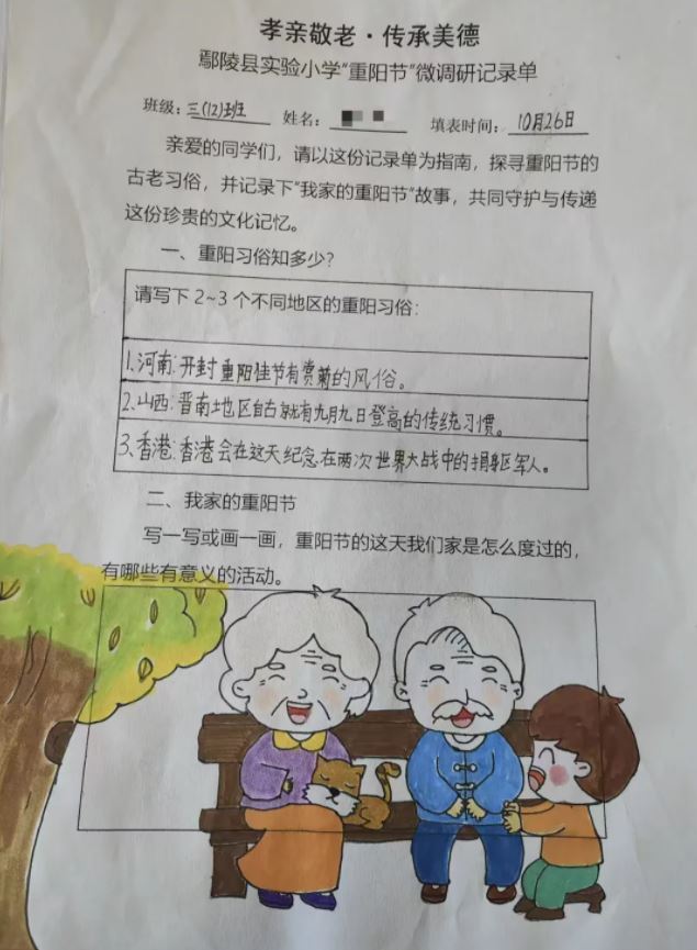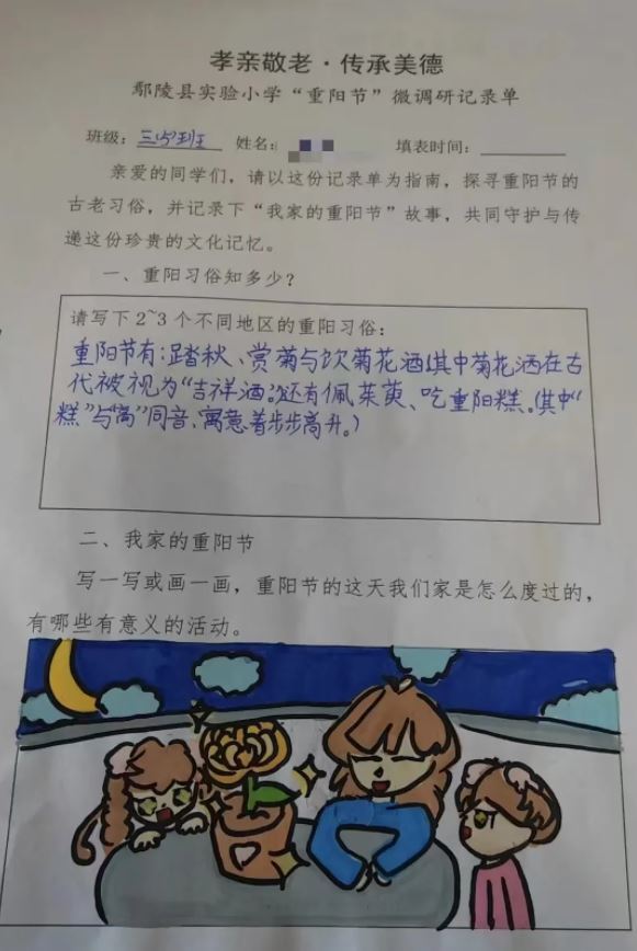 一笔一画记录习俗变迁,一言一语倾听岁月回响。三、四年级的少先队员们化身为“文化小侦探”,采访家中的长者,听奶奶讲她小时候的重阳;看爷爷画他记忆里的菊花酒。他们用笔记录,用图描绘,一张张A4纸上,不只是习俗的变迁,更是家国情怀的传承。