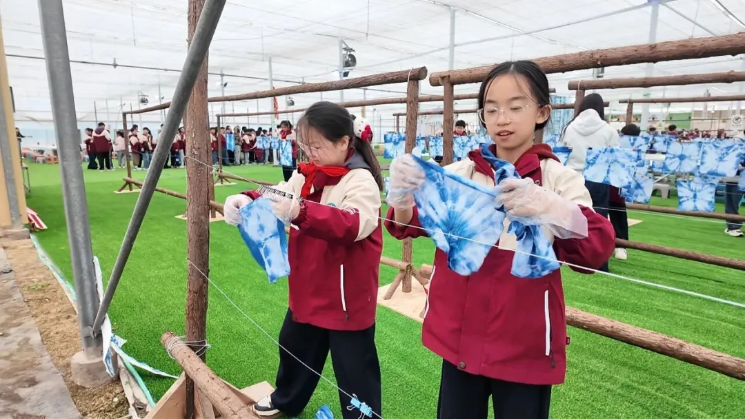 扎染体验环节,更是让队员们沉浸在色彩与创意的世界里。基地老师先示范了“捆扎”“折叠”等基础技法,讲解染料与面料的融合原理。队员们迫不及待地拿起白色方巾,用皮筋扎出星星、花朵等不同图案,再将其浸入靛蓝色染料中,当解开皮筋,看到方巾上浮现出独一无二的蓝白花纹时,现场响起阵阵惊叹。队员们了解到扎染技艺背后的环保理念,深刻感受传统手工艺的独特魅力。