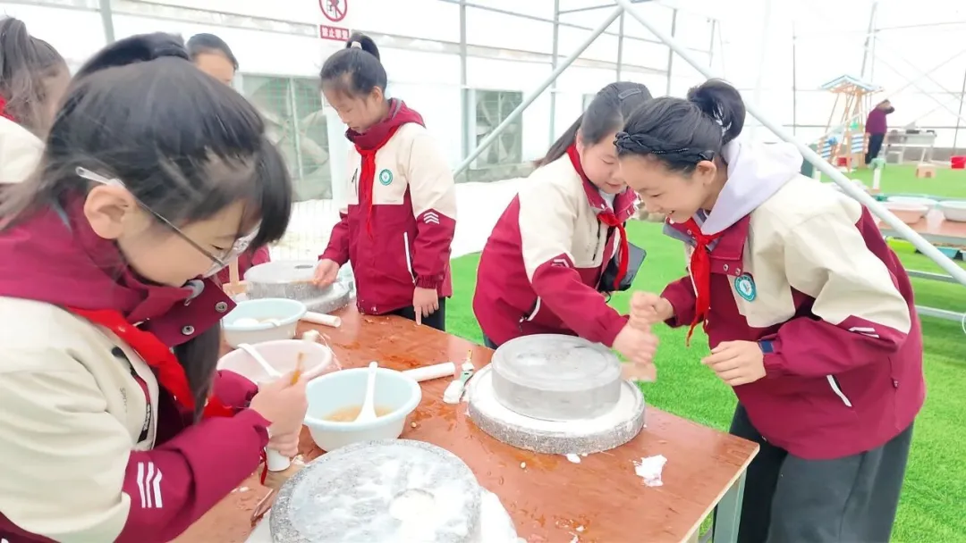 最具烟火气的环节当属石磨豆浆体验。在磨房里,队员们两人一组,一人扶着磨柄缓慢转动,一人往磨眼添入泡好的黄豆和清水。随着石磨的转动,乳白色的豆浆缓缓流出,大家分工合作,亲身感受“从豆子到豆浆”的全过程。手绘帆布袋和幼苗移栽活动则融合了美育与劳动教育,让队员在独立创作中展现个性,在种植中感悟生命成长。