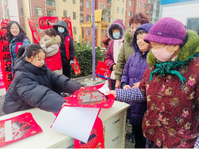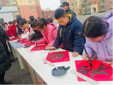 1月30日上午,山东省烟台市福山区天府街小学少先队大队部组织骨干队员代表与党员教师走进社区,开展“笔墨传情暖社区 红领巾携手迎新春”书春送福活动。
