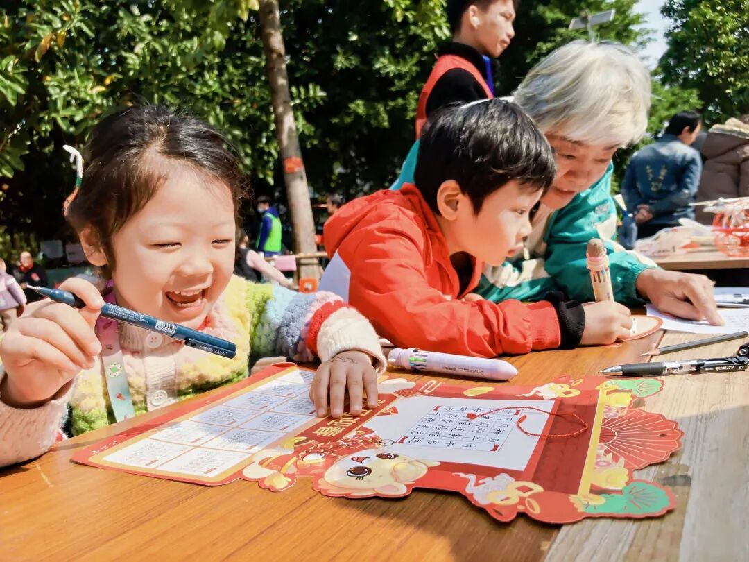 不仅如此,其他活动区域也洋溢着浓浓的年味。在“巧手迎新工坊”创意体验区,同学们动手制作非遗螺钿新春饰品、用毛笔书写春联福字、编织中国结,并在专业老师的指导下完成硬笔书法年历,在静心创作中深入感悟传统文化之美。“年俗闯关大作战”趣味互动区里,多组家庭协作完成新春拼图、挑战民俗障碍赛、猜灯谜、玩转诗词飞花令、一起跳起手势舞。