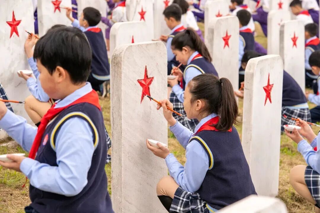 无名烈士墓区,同学们手持工具为墓碑描红,一笔一画勾勒英烈之名,让红色印记永不褪色。