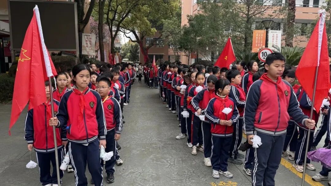 清晨,五年级各中队列队完毕,队伍启程。一路上,队员们步伐整齐,神情庄重,队伍井然有序,成为春日街头一道肃穆而动人的风景。