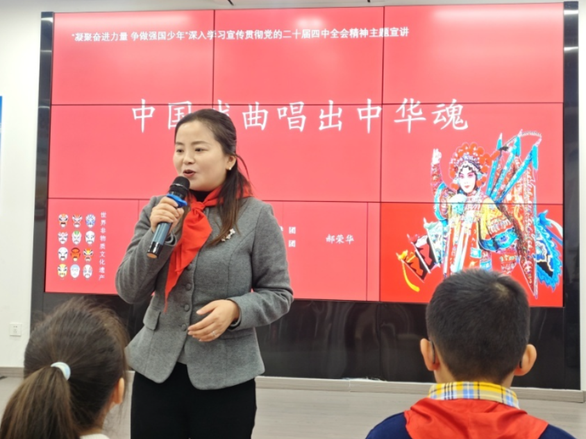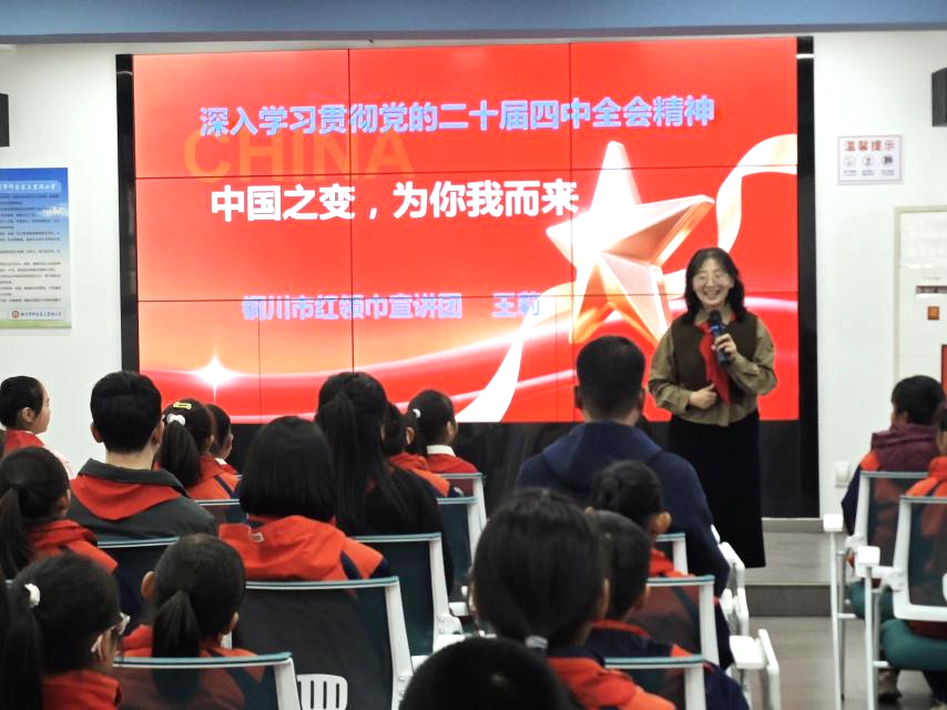 活动中,全国红领巾巡讲团成员王莉以《中国之变 为你我而来》为题,为队员们系统阐释了党的二十届四中全会的基本概况与时代意义;来自新区文家明德小学的红领巾讲解员,围绕《我们的“小梦想”与国家的“大蓝图”》,用亲切生动的语言,讲述了个人理想融入国家发展的成长故事;陕西省红领巾巡讲团成员、铜川市巡讲团团长、铜川市新区裕丰园小学副校长郝荣华,以《中国戏曲唱出中华魂》为题,从文化自信的角度,诠释了中华优秀传统文化的当代价值;省、市级红领巾巡讲团成员、三里洞小学副校长兼大队辅导员彭雪梅,则以《灯火照亮幸福路》为题,透过民生改善的鲜活图景,展现了国家发展带来的温暖与进步。
