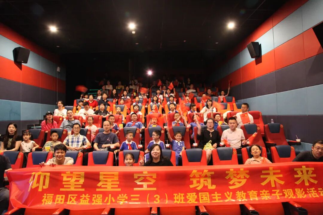 益强小学三(3)中队的同学们与家长一同参与了《窗外是蓝星》亲子观影活动,以一场别开生面的行走思政课,抒发新时代少年对祖国的热爱与祝福。活动尚未开始,孩子们已早早来到现场,身着整洁校服,佩戴鲜艳红领巾,在展示牌前留下雀跃的身影。挺拔的身姿、期待的眼神,无不诉说着对这场星空之约的珍视,更传递着对祖国的深情与自豪。