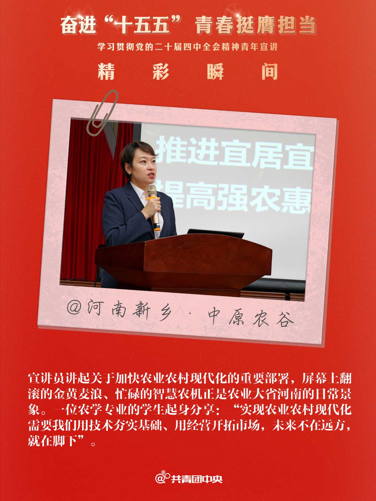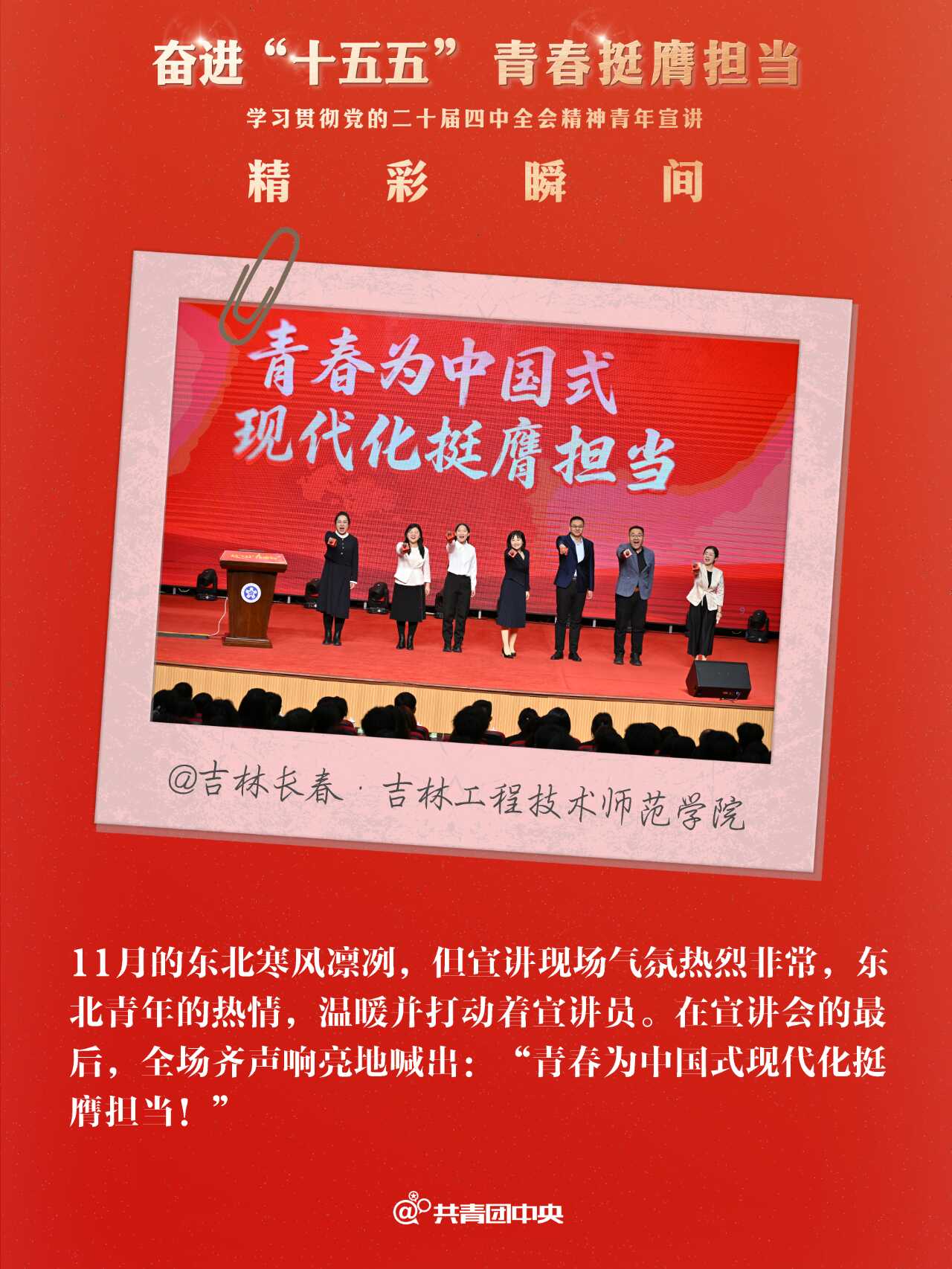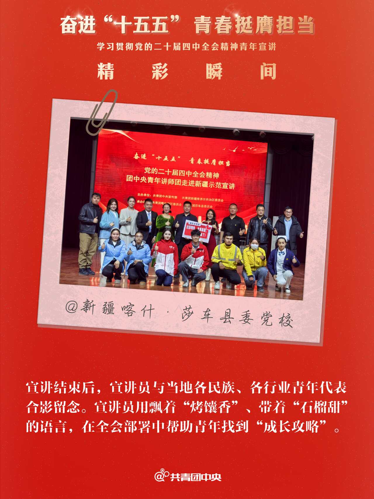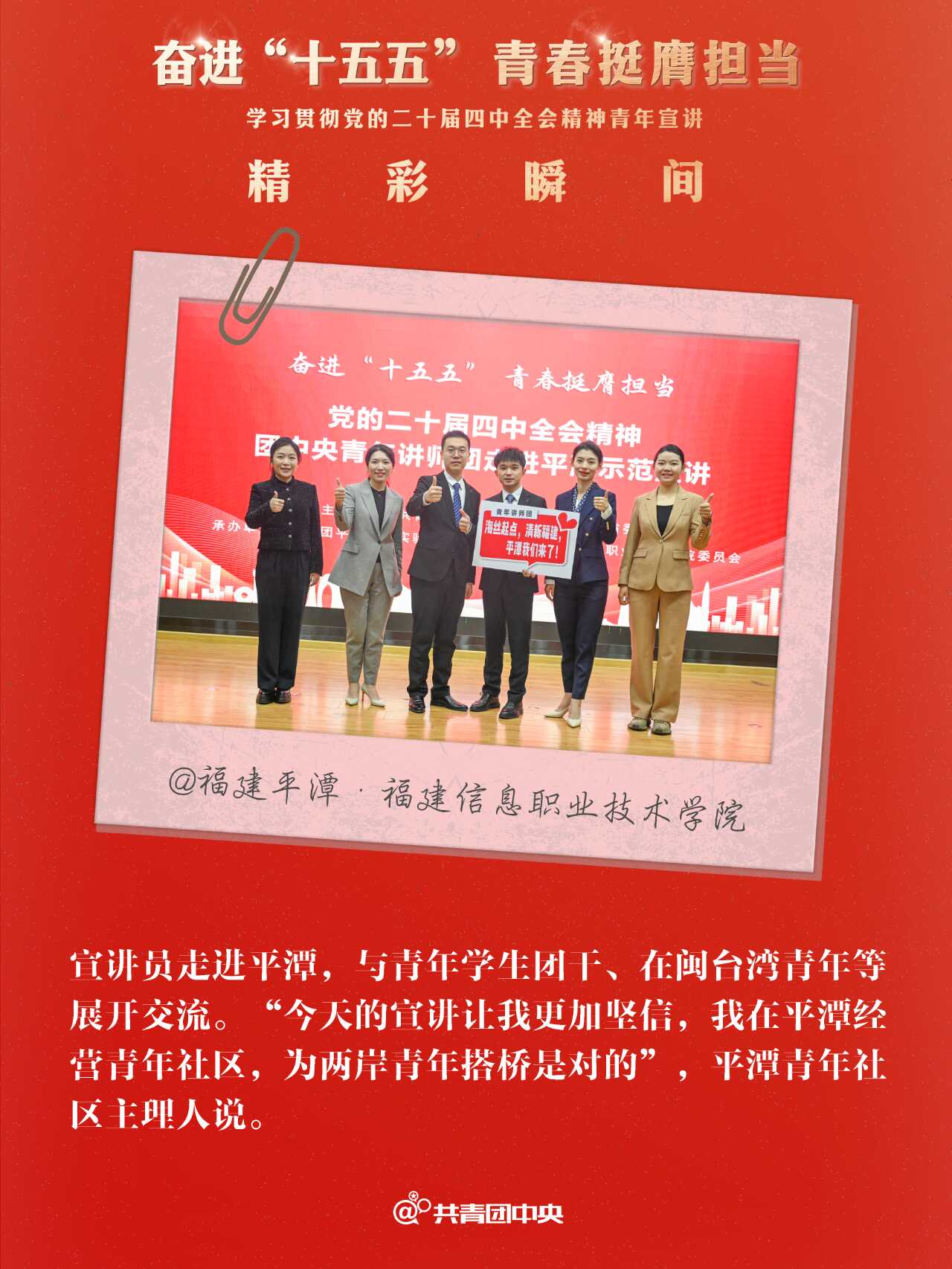 近期,共青团中央组织青年讲师团成员先后赴24个省份的49个地市举办“奋进‘十五五’ 青春挺膺担当”学习贯彻党的二十届四中全会精神青年示范宣讲,用“青言青语”与各地青年一同回顾“十四五”、畅想“十五五”,同步部署指导省、市两级青年讲师团向下延伸,在300多个地市、2800多个县区有序开展示范宣讲,带动基层青年宣讲队伍实现全会精神宣讲对青年的广泛覆盖。