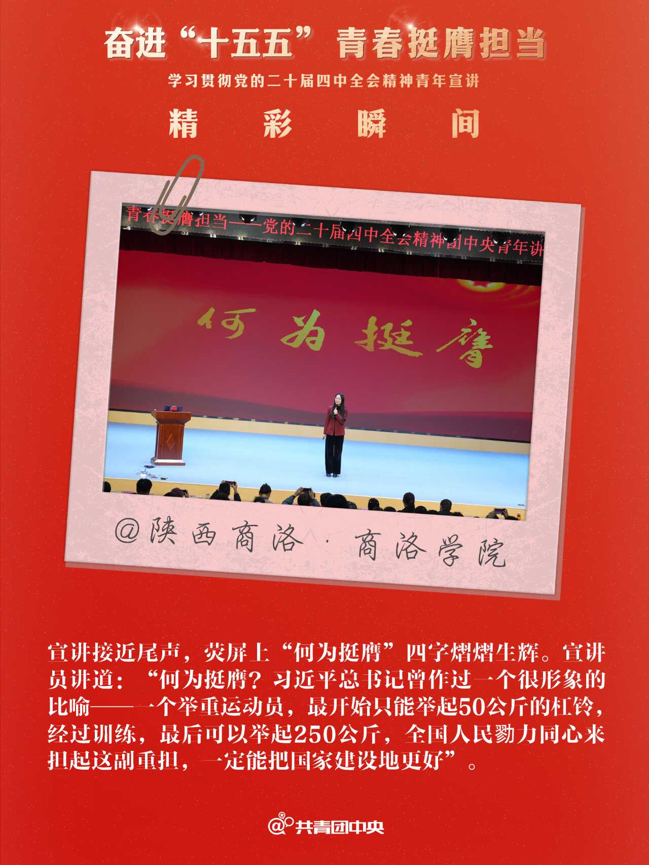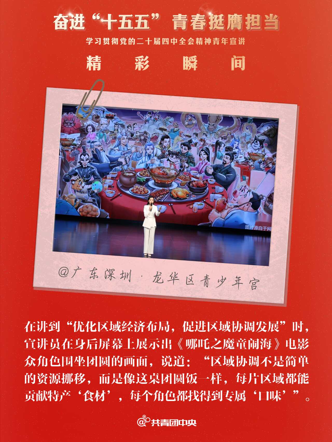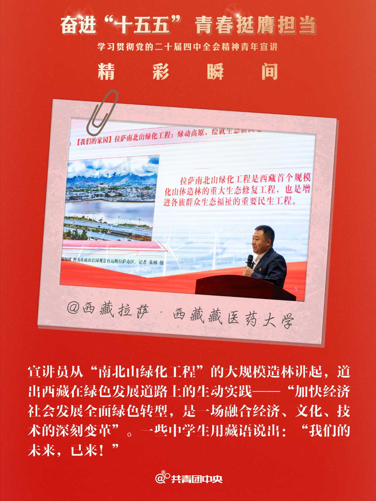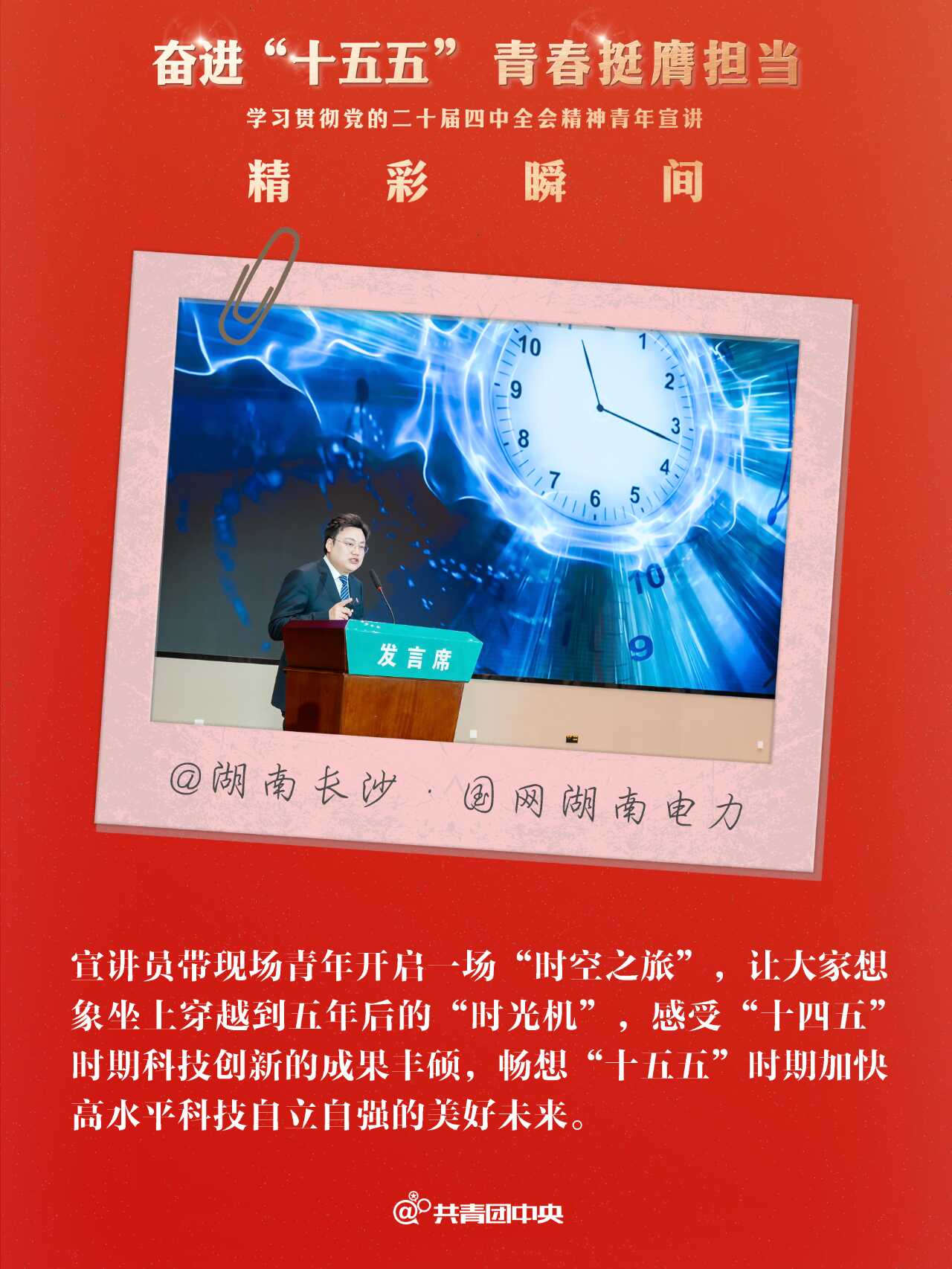 近期,共青团中央组织青年讲师团成员先后赴24个省份的49个地市举办“奋进‘十五五’ 青春挺膺担当”学习贯彻党的二十届四中全会精神青年示范宣讲,用“青言青语”与各地青年一同回顾“十四五”、畅想“十五五”,同步部署指导省、市两级青年讲师团向下延伸,在300多个地市、2800多个县区有序开展示范宣讲,带动基层青年宣讲队伍实现全会精神宣讲对青年的广泛覆盖。